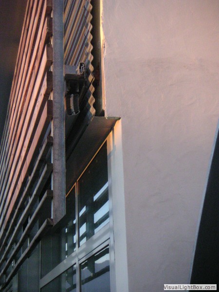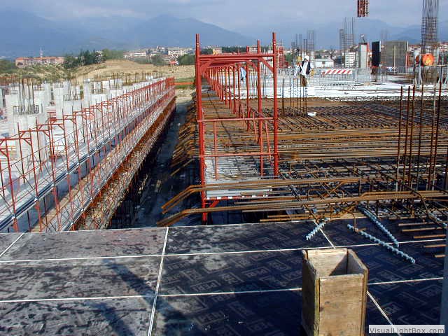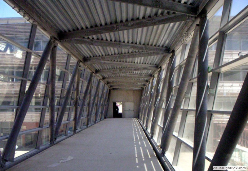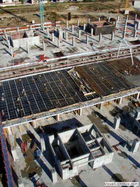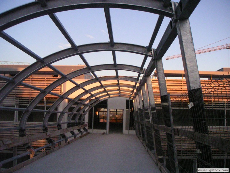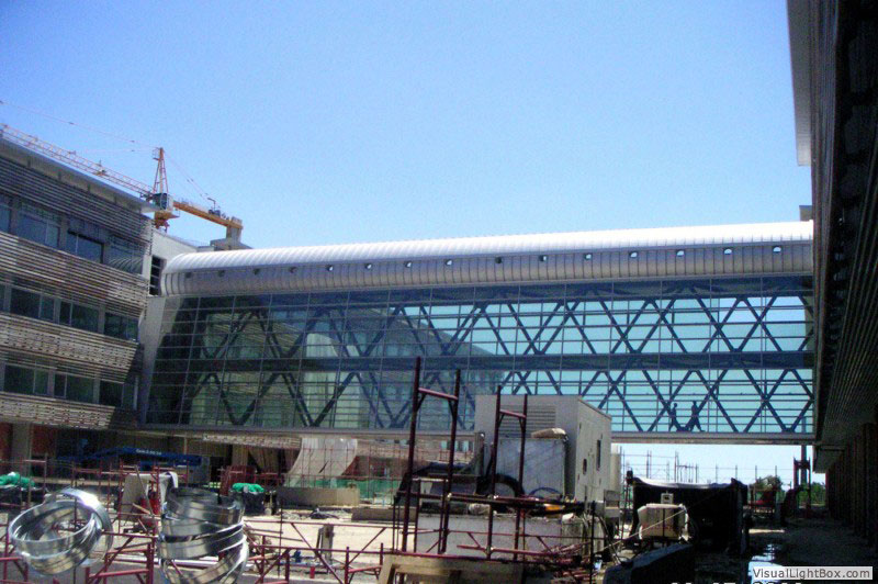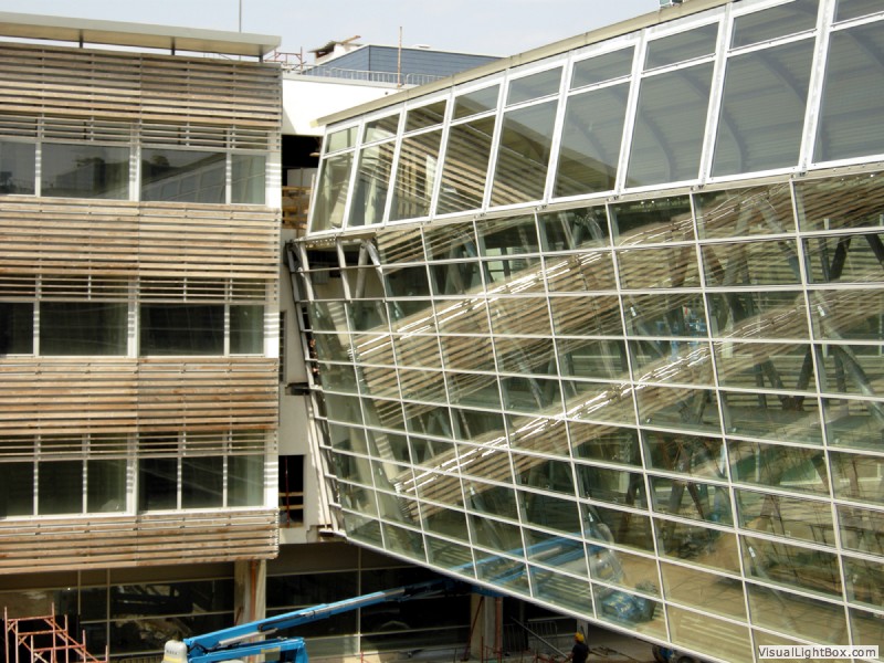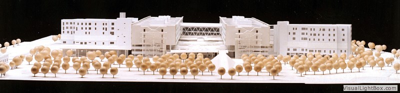 Nel corpo centrale rettangolare, di circa 170x100 m, la “piastra dei servizi” comprende il livello dell’ingresso principale, in cui sono organizzati i servizi di diagnostica, terapia ed i servizi generali; dall’atrio su due livelli collegati da una rampa, attraverso aree dedicate a funzioni di tipo amministrativo e ambulatoriale, si articola la distribuzione interna: larghi corridoi, ascensori e scale mobili, che portano ai due percorsi, paralleli al giardino pensile, attrezzati con servizi e spazi commerciali. Gli ascensori di risalita verso i piani di degenza conducono direttamente nel “settore” previsto, riducendo le interferenze con le altre aree.