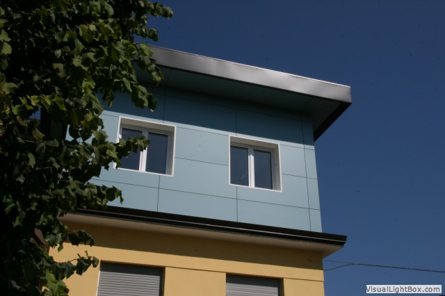 comprendente la demolizione dei cornicioni ammalorati e del muretto d’attico all’ultimo piano, la sostituzione di alcune finestre con porte in corrispondenza delle nuove uscite di emergenza e lo scrostamento dell’intonaco fino al vivo della muratura con realizzazione di nuovo intonaco arenino e tinteggiatura dei prospetti